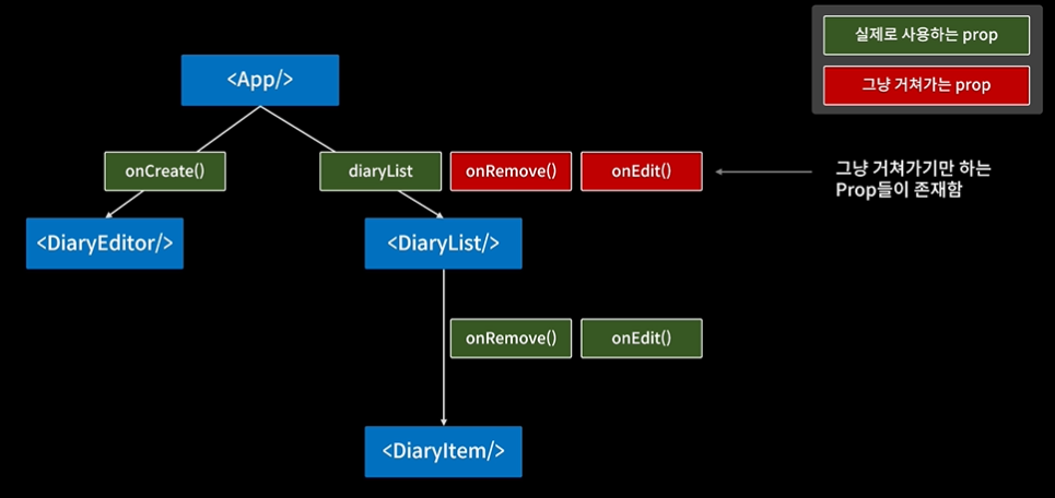 하지만 onDelete와 onEdit 함수는 DiaryList 컴포넌트에서 사용하지 않고 거쳐 지나가는 용도이다. 전달만 하는