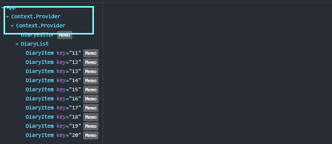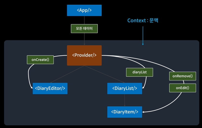 컴포넌트의 영역을 Context( 문맥 )이라 한다. provider 컴포넌트 아래에 있는 모든 컴포넌트들은 일기 데이터를