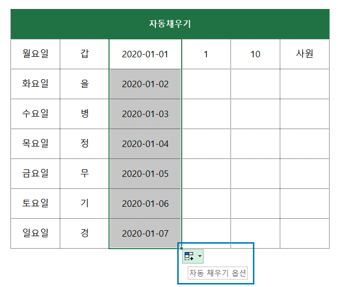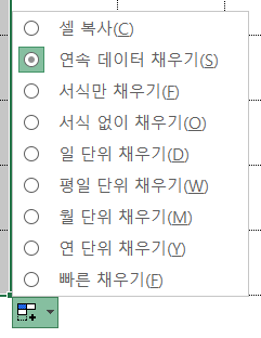 자동 채우기를 하면 우측 하단에 자동 채우기 옵션이 존재