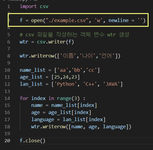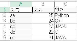 wtr.writerow(['이름','나이','언어'])