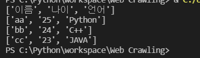 writerow 함수가 데이터를 한 행씩 넘어가면서 저장하는 것을 확인 가능.
